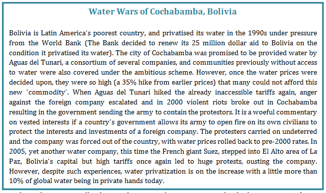 How does this supposedly distant decision relate to us, as individual consumers of water? Today, water is a $ 400 billion dollar global industry; the third largest behind electricity and oil. Most of the privately owned water in the world is in the hands of four major companies, Suez and Veolia being the largest. To understand the significance of the commodification of water, exploring the Bolivian story may provide pointers (See Box).