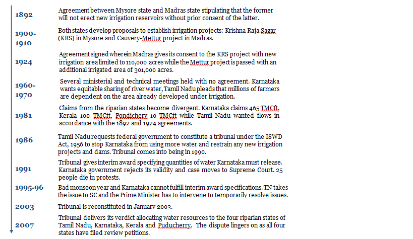 As in other parts of the world, water scarcity and sharing has often led to conflict and legal dispute. Let us examine the issue of water sharing of Kaveri, a perennial rain fed river in south India, between the states of Karnataka (upstream) and Tamil Nadu (downstream). The conflict is regarding two controversial agreements (in 1982 and 1926, see timeline) between the Madras Presidency (Tamil Nadu) and the Princely State of Mysore (Karnataka) which the latter claims is skewed in favour of the former.