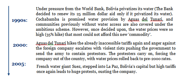 Growing awareness about the need for sustainable water utilization, increased research interest at a global level and active civil society participation has led to the naming of water as \’blue gold\’ with scientists predicting an age of water wars in the near future, where scarcity of water will trigger civil unrest and battles over this live giving commodity. How does a supposedly free and plentiful resource like water get associated with war and conflict? For this let us explore the highly politicized water economy and look at the example of Cochibamba in Bolivia, Latin America\’s poorest country.