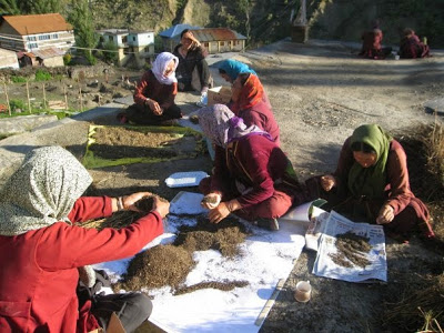 She is referring to Inula racemosa, a plant found growing naturally in the western Himalayas at high altitudes (2600-4000m). The roots of the Inula plant have medicinal properties and are used in Ayurvedic preparations. Owing to the high price the roots command in the market, and the optimal growth conditions found in Lahaul, Inulais being promoted by local NGOs as a potential source of additional income for Lahauli farmers. The women’s group is one of many that manages Inula ‘kitchen gardens’, little patches of land in their backyard on which they grow the herbs to sell at the group level. The roots take three years to mature and develop medicinal properties so it is a time-intensive enterprise but the women are upbeat and willing to try something new. I find this refreshing and quite characteristic of the Lahauli spirit.