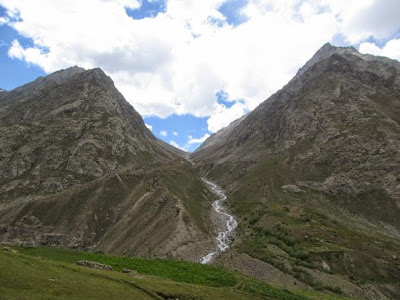 | The majestic Himalayas in Lahaul and one of the many ivory-thread streams. |