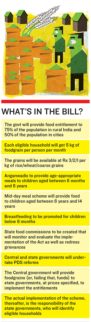 What? The National Food Security Bill aims to provide food to 67% of India\’s 1.2 billion people by distributing heavily subsidized food grain (5kg of grain @ Rs.1/kg). First introduced in 2011, the bill has invited heated debate, caused parliamentary disruptions and is yet to be passed.