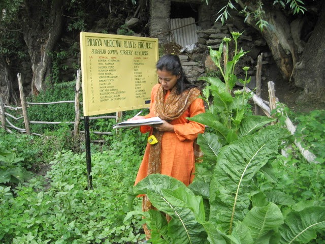 | Filling up a monitoring form for a medicinal plant nursery in Keylong, Himachal Pradesh (2008). |