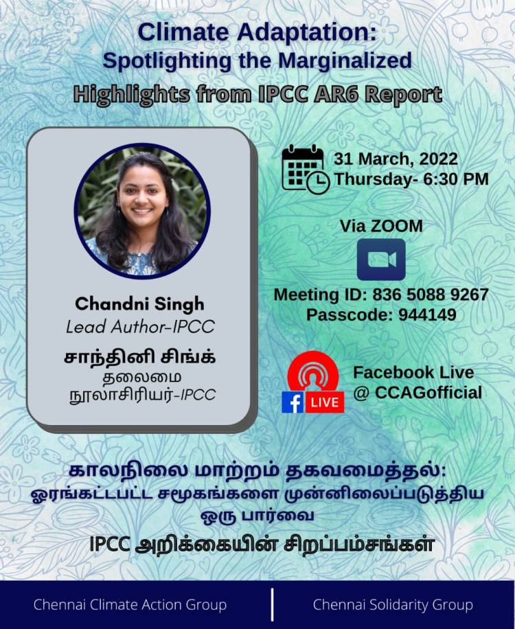 31 March 2022 | A webinar in English and Tamil with Chennai Climate Action Group on climate change adaptation in India, focussing on differential vulnerability, histories of extraction and colonisation, and avoiding maladaptation for marginalised communities and ecosystems.