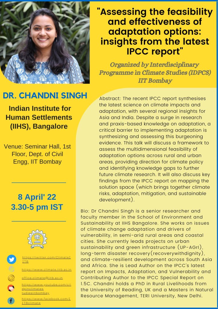 8 April 2022| A talk on “Assessing the feasibility and effectiveness of adaptation options: insights from the latest IPCC report” at IIT Bombay’s Interdisciplinary Programme in Climate Studies.