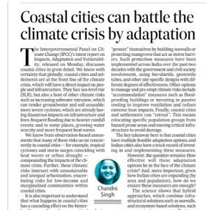 01 March 2022| An op-ed in The Hindustan Times on coastal adaptation in Indian cities drawing from the chapter on ‘Cities and Settlements by the Sea’ in the IPCC’s Sixth Assessment Report. [Link]