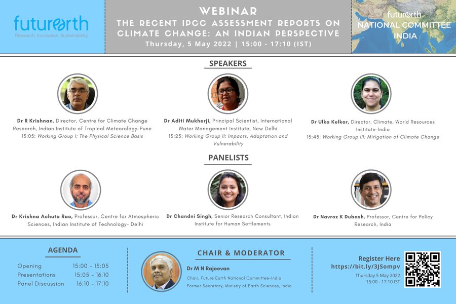 5 May 2022| Panel discussion on the implications of the IPCC Assessment Report 6’s findings for India, drawing on Working Groups I, II, and III, hosted by Diveccha Centre for Climate Change, IISc. [Link]