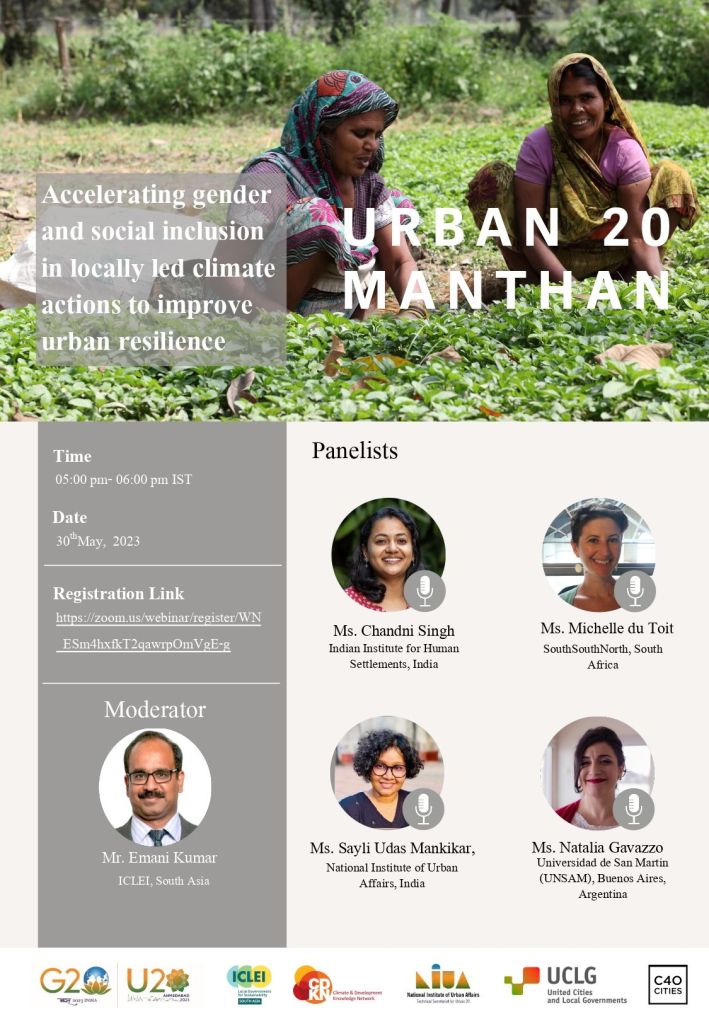 30 May 2023 | Panel on gender, climate resilience and social inclusion, organised as part of Urban20 by ICLEI South Asia, National Institute of Urban Affairs, and Climate and Development Knowledge Network.